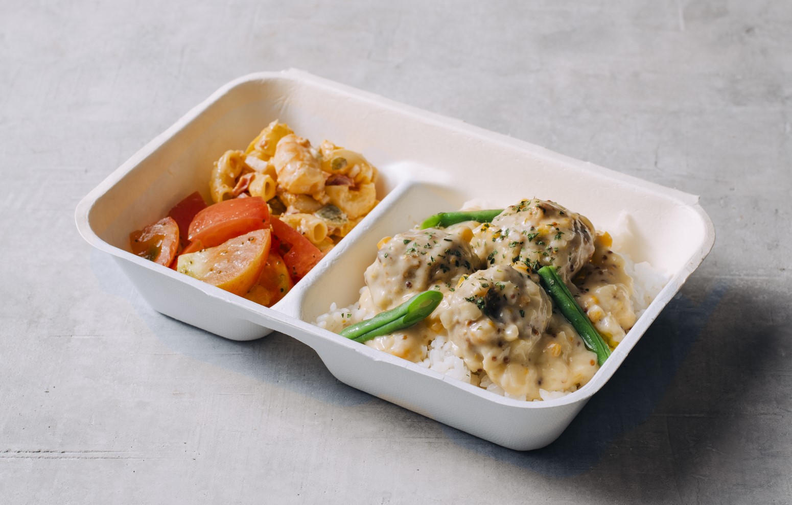 粒マスタード入りのさっぱりしたクリームソースと一緒にミートボールを煮込みました。仕上げにインゲンを散らしています。付け合わせは、トマトのセロリシードのマリネ、海老とパプリカのサウザンパスタサラダを添えています。
