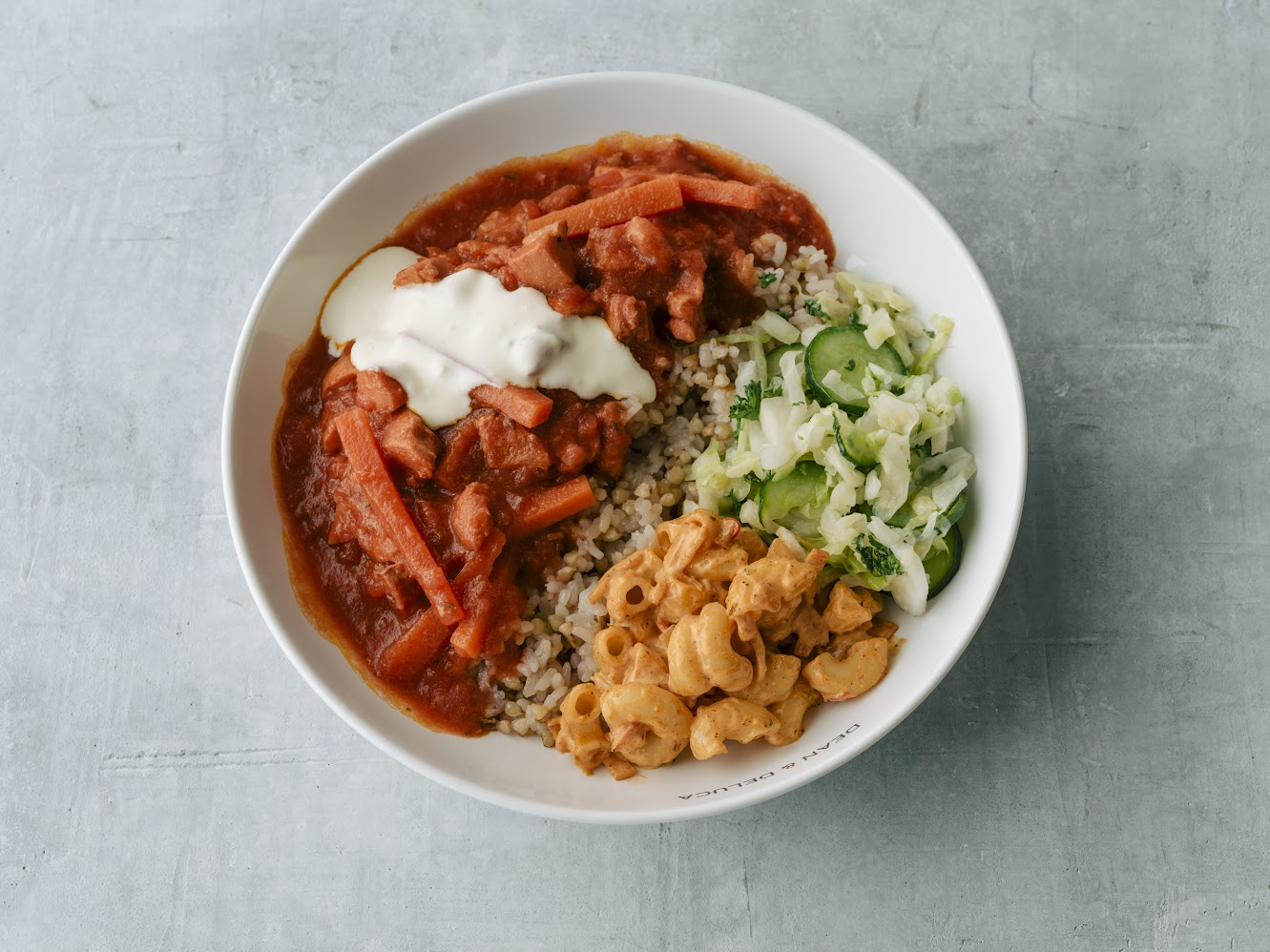 ウクライナでよく食べられる食材であるビーツやそば米を使用したオーバーライスです。鶏肉をボルシチ風に軽く煮込み、そば米やレーズンを加えたバターライスとともに提供します。キャラウェイの香りを効かせ、異国情緒を演出しています。鶏肉の煮込みおよびコールスローは、アンナさんに教わったレシピをアレンジしたものです。